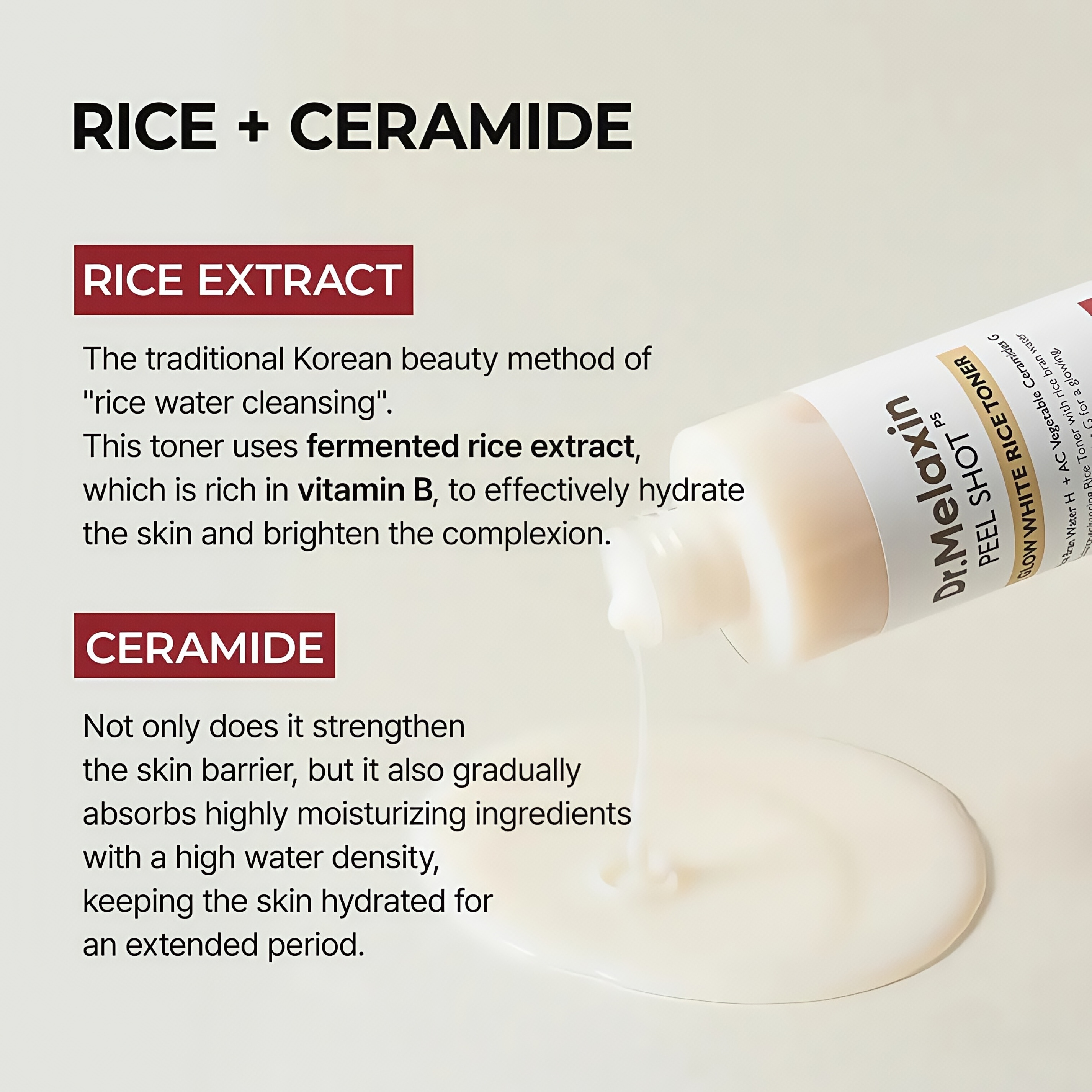 Unlock the power of rice-based skincare. Dr.Melaxin PeelShot Rice Toner combines nourishing Rice Bran Water and Rice Amino Acids to revitalize dull skin, deliver essential nutrients, and enhance natural glow. High-molecular Ceramide helps seal in moisture for all-day hydration. This advanced formula leverages rice fermentation technology to visibly refine skin’s texture and even out tone.